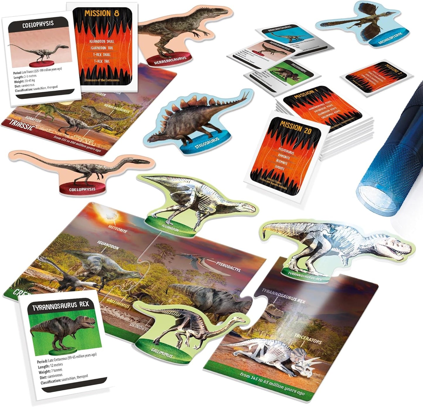 Highlights Perfect for young dinosaur enthusiasts, offering a hands-on way to learn about the prehistoric world through fun and engaging activities. Includes 3 Mesozoic scenarios and 8 dinosaur-shaped cut-outs. Comes with 40 dinosaur cards and 20 mission cards for interactive play. UV torch allows children to uncover dinosaur skeletons. Ideal for children aged 6-10.