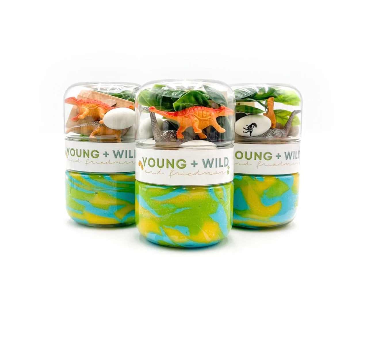 Our Grab & Go Dough Jars are a new YWF product, and we love them so much! The Dinosaur Grab & Go Dough Jars come with one jar of our amazing all-natural sensory dough and a separate screw-on jar filled with everything you need to make the cutest prehistoric scene!