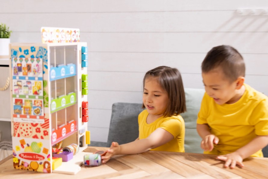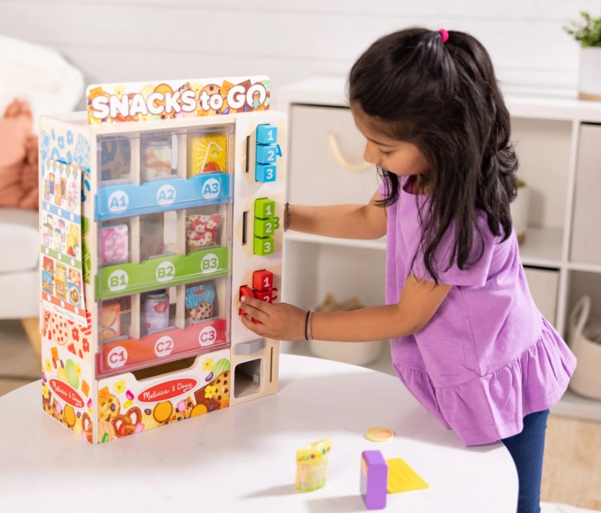 Fun interactive play as you sort, stock, and select play food items in a wooden vending machine with play coins! Includes 19 pieces like snack bars, drink cans, snack pouches, coins, bank card, and more. Enjoy educational fun using the reusable activity card for stocking and display, great for toys and small food packages from home. Encourages skill development by teaching cause-and-effect, imaginative play, sorting, counting, and letter recognition. Ages 3+